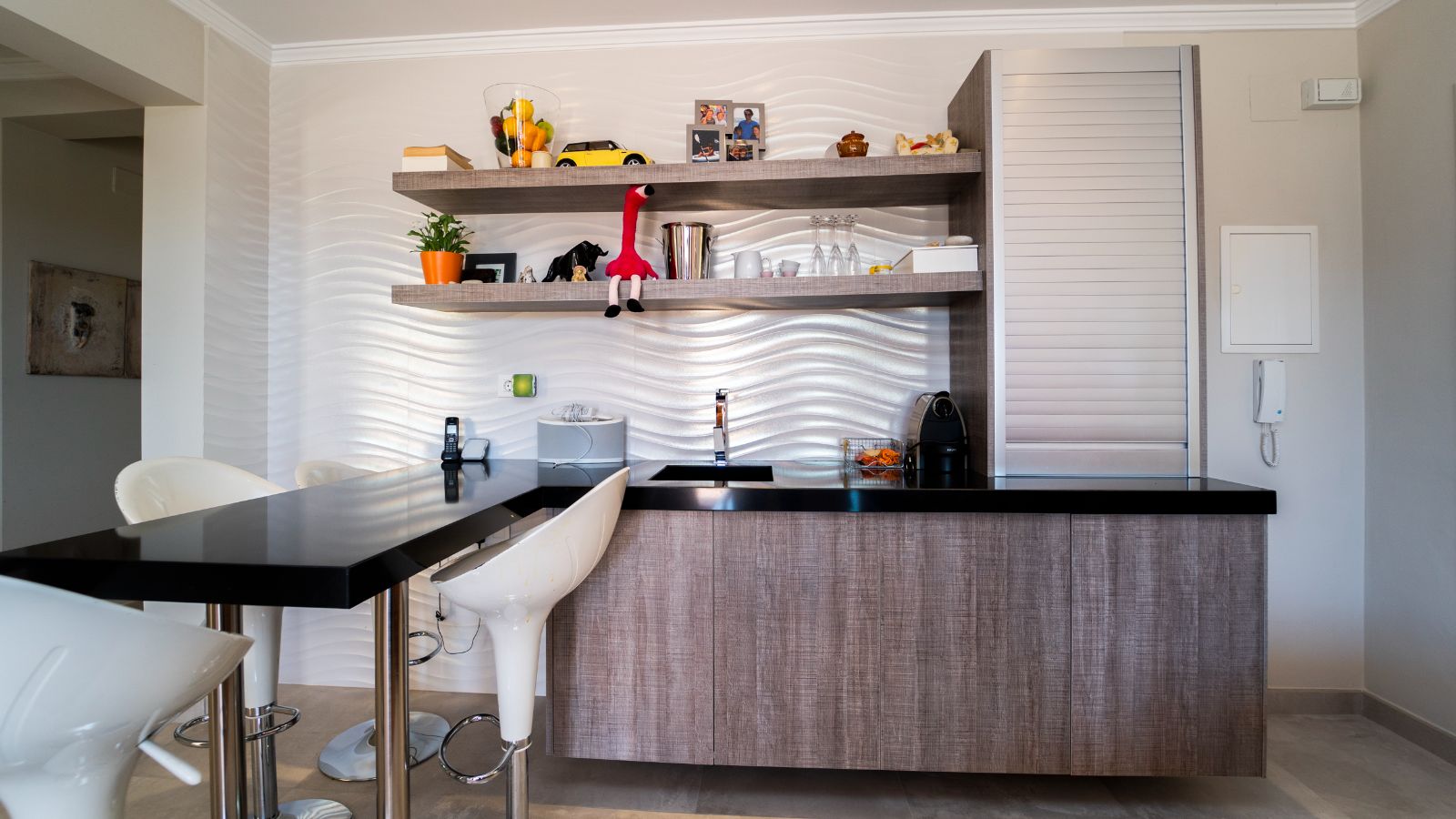 The upper floor is divided into a large living area with large fully equipped modern open kitchen, 1 bedroom and bathroom. Television and WiFi.  And entrance to a lovely terrace to enjoy the sun and an open view to the sea.