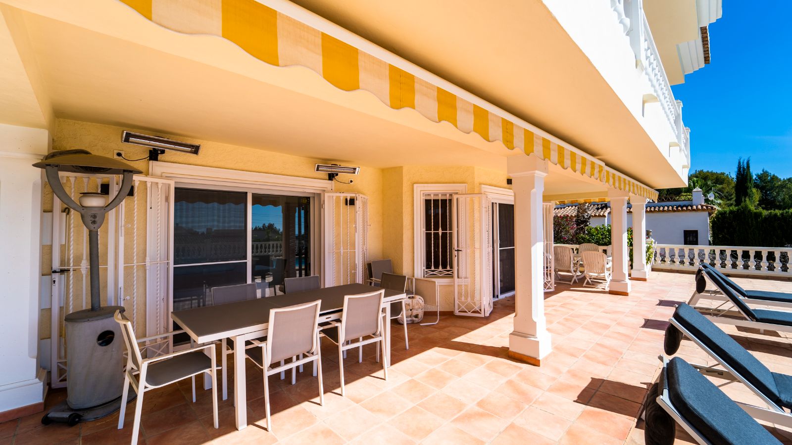 There is a large spacious terrace with an open view. Downstairs is the private swimming pool (heated) with plenty of space around it and garden. Also a large driveway with space for several cars.