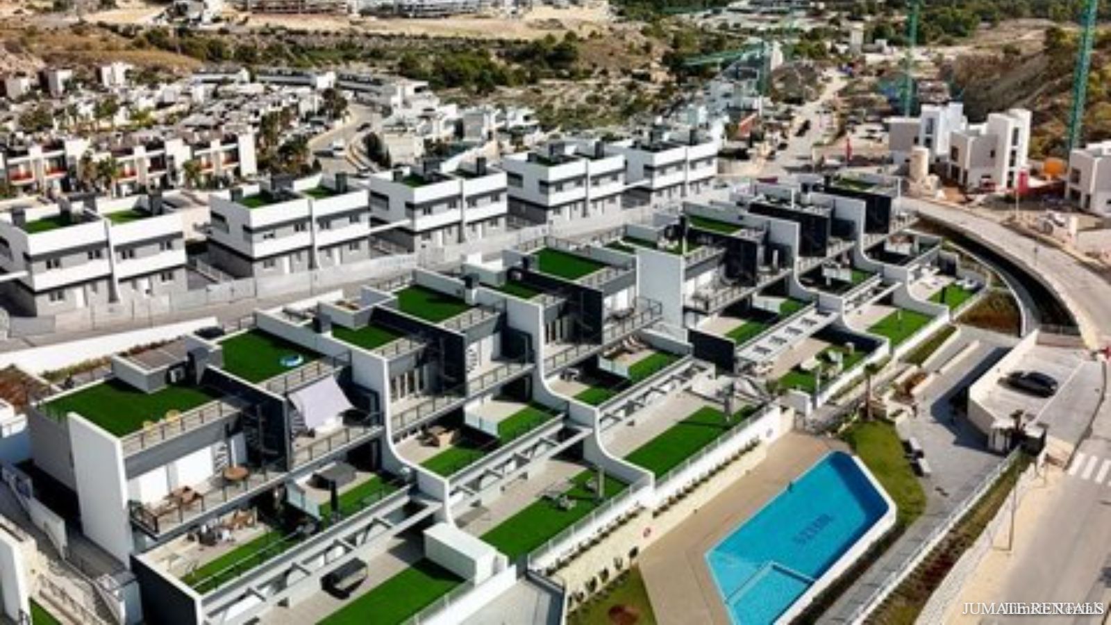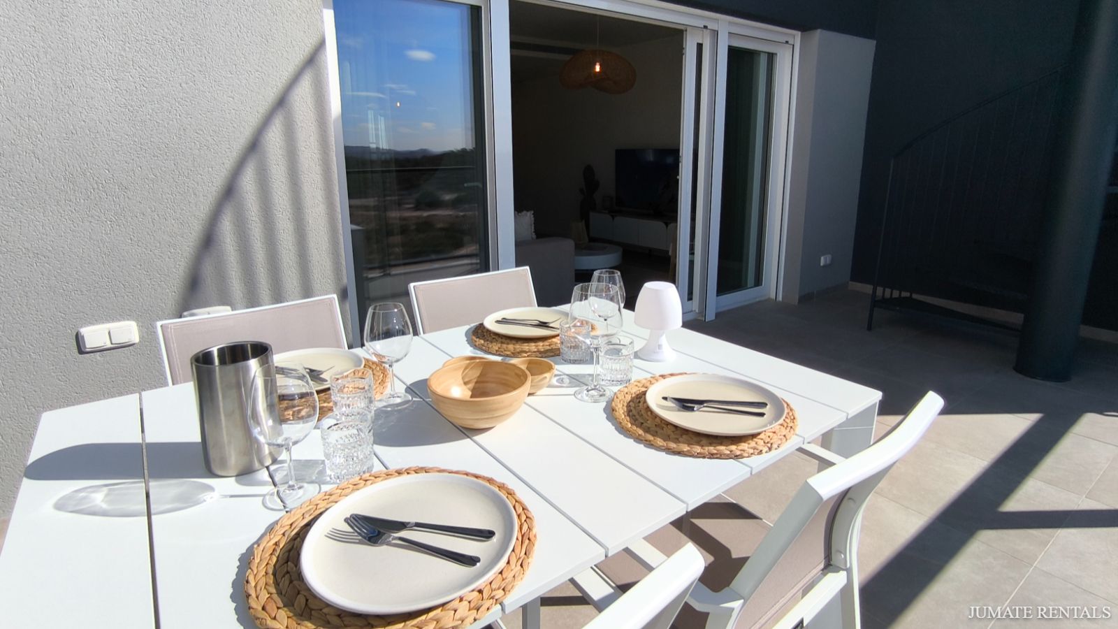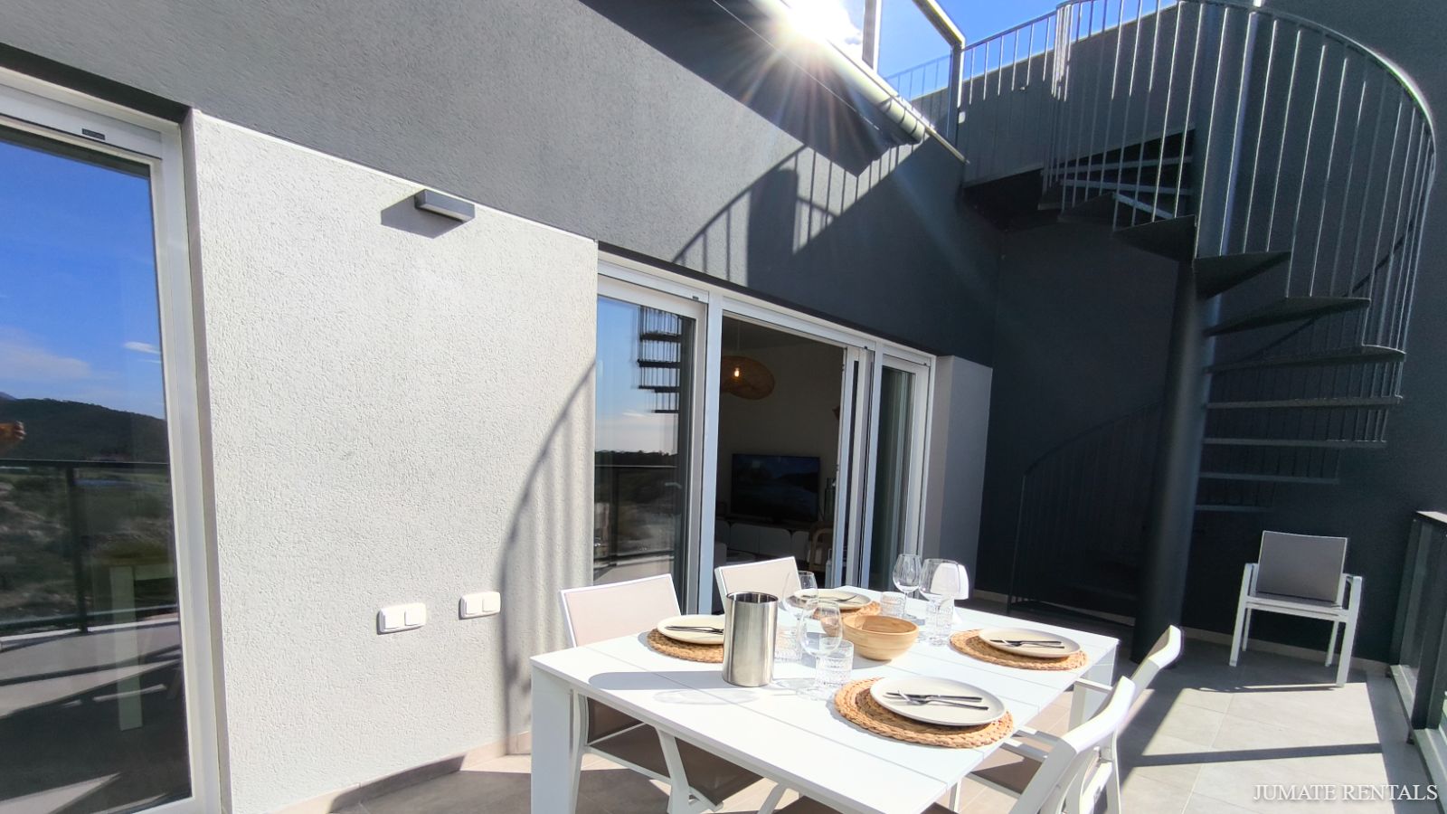 From the living room, you step out onto a sunny terrace overlooking the golf course, ideal for morning coffee or an evening drink. On the upper level, you’ll find a large rooftop terrace with sun loungers and comfortable lounge furniture—the perfect spot to relax and soak up the sunshine.