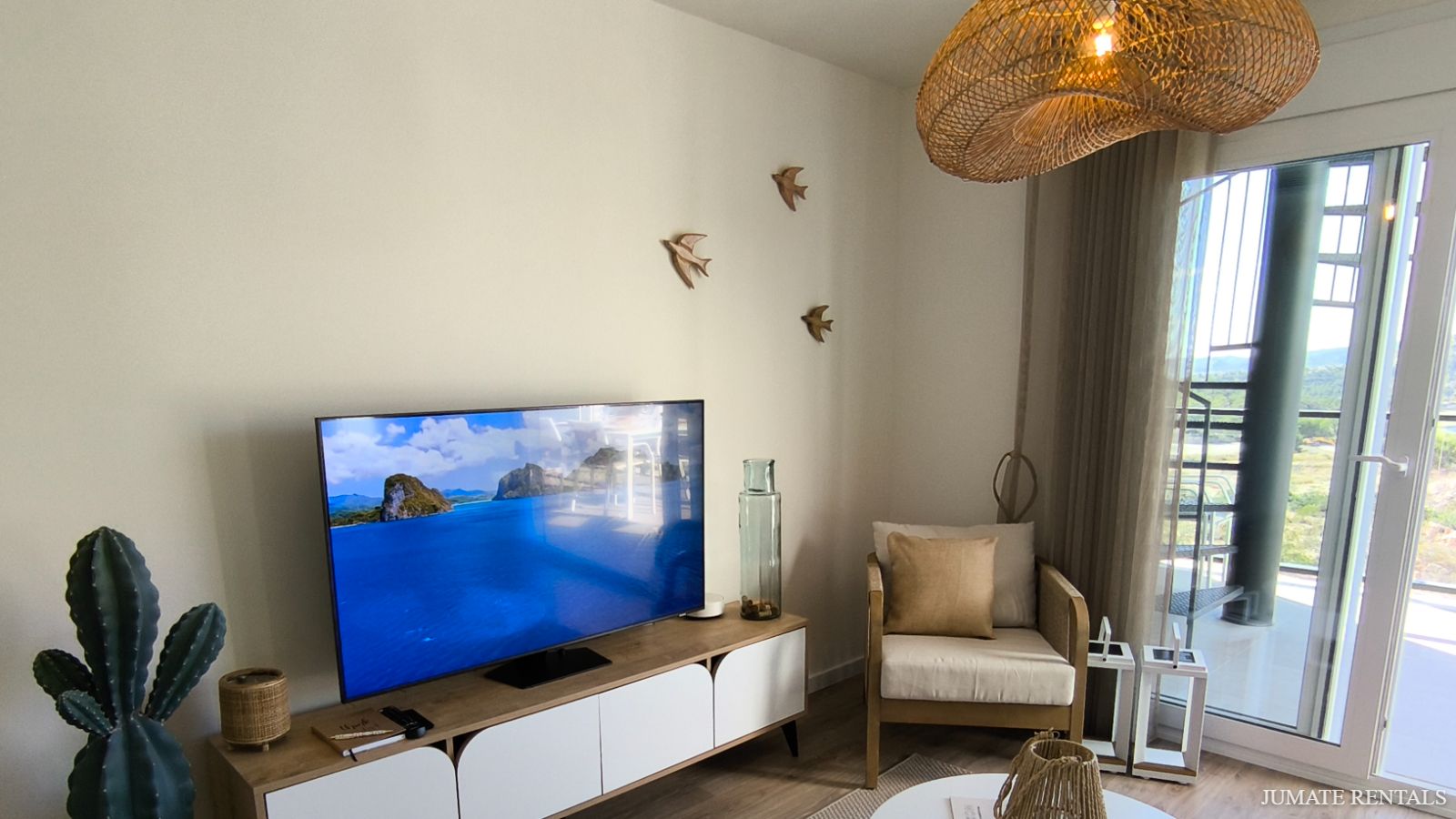 The bright living room includes a smart TV and free Wi-Fi, and opens onto a fully equipped open kitchen with a ceramic hob, dishwasher, oven, microwave, and all necessary cooking utensils.